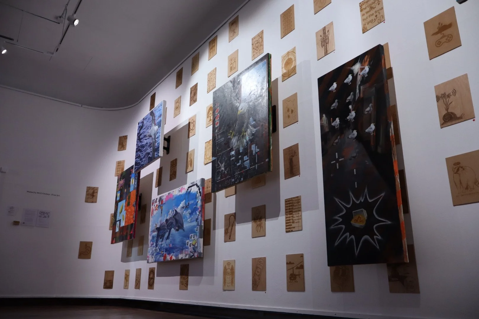 “…Malachy McCrimmon has taken over one end of the Cooper Gallery with an installation of 2D works that somehow jump out from the wall with a sculptural, or rather animated, quality. Filled with polarising imagery, the work behaves like a cacophony of post-internet noise and pixelated birdsong. Though purely visual, composed of paintings and laser-engraved wooden panels, it has the effect of something that sings. Reminiscent of digital doomscrolling, the installation forms a pop-up ad-like overload of visual information. It features dolphins, anime girls, eagles catching drones and laughing face emoticons, and amounts to a captivating display concerned with the technical errors of the modern and natural world.”
